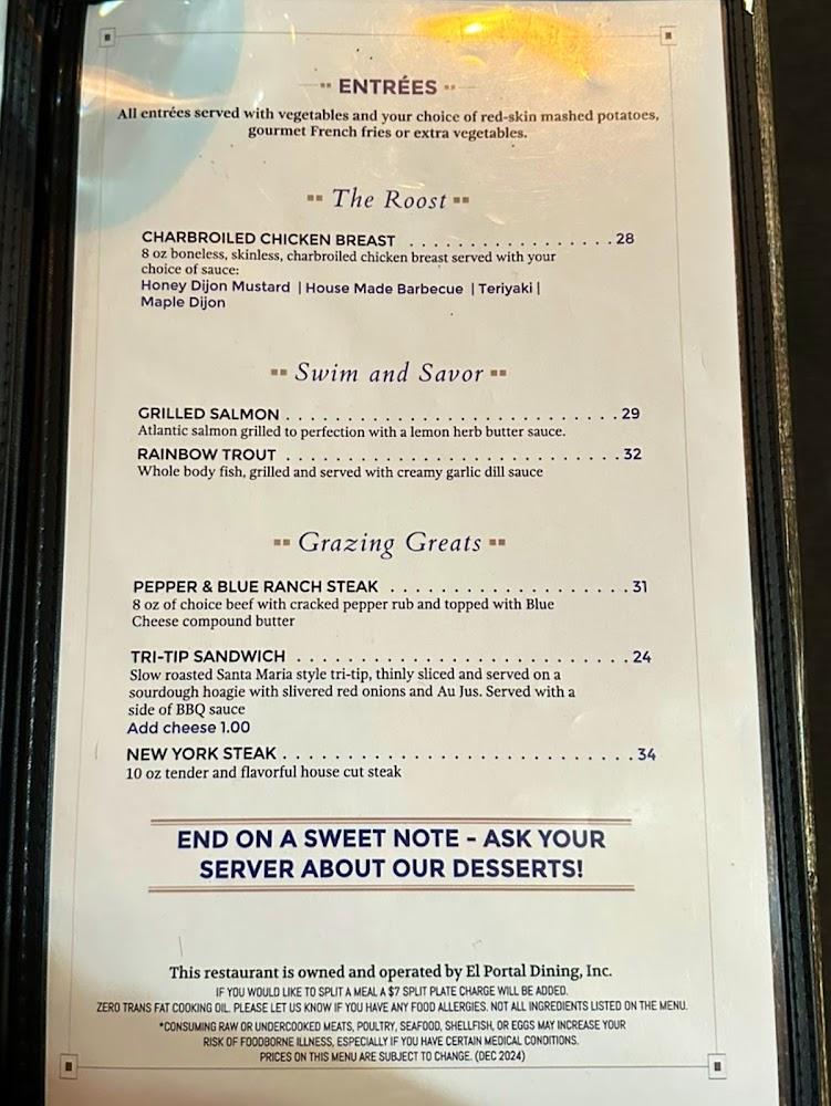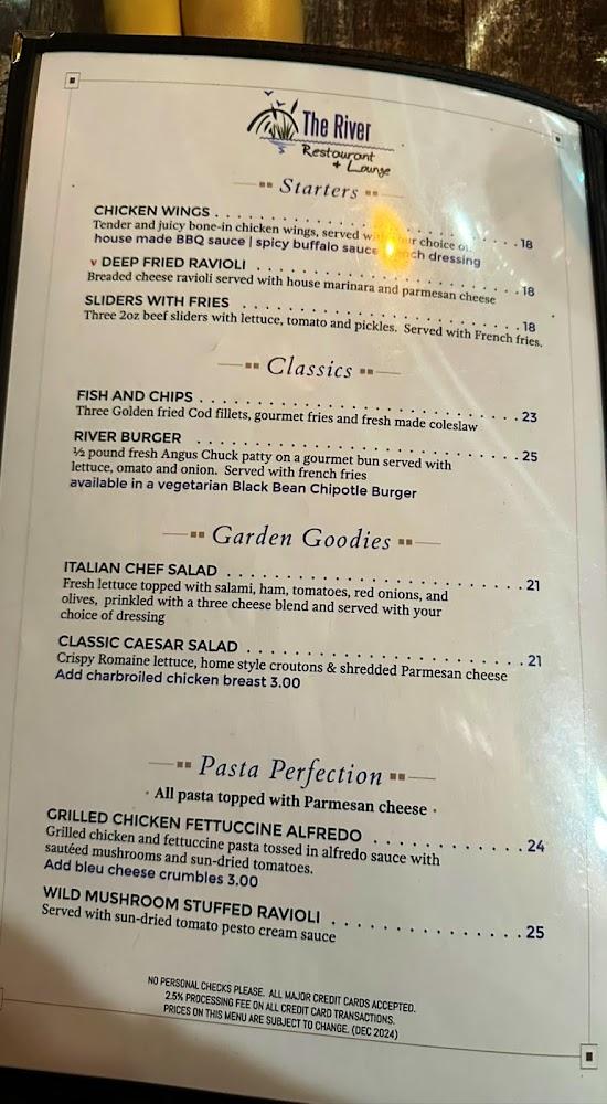 The River Restaurant & Lounge features a diverse menu. Breakfast options include hearty plates like Buttermilk Pancakes, Farmers Choice, and the delightful Half Dome Omelette. Light sides complement each meal, making every bite satisfying.